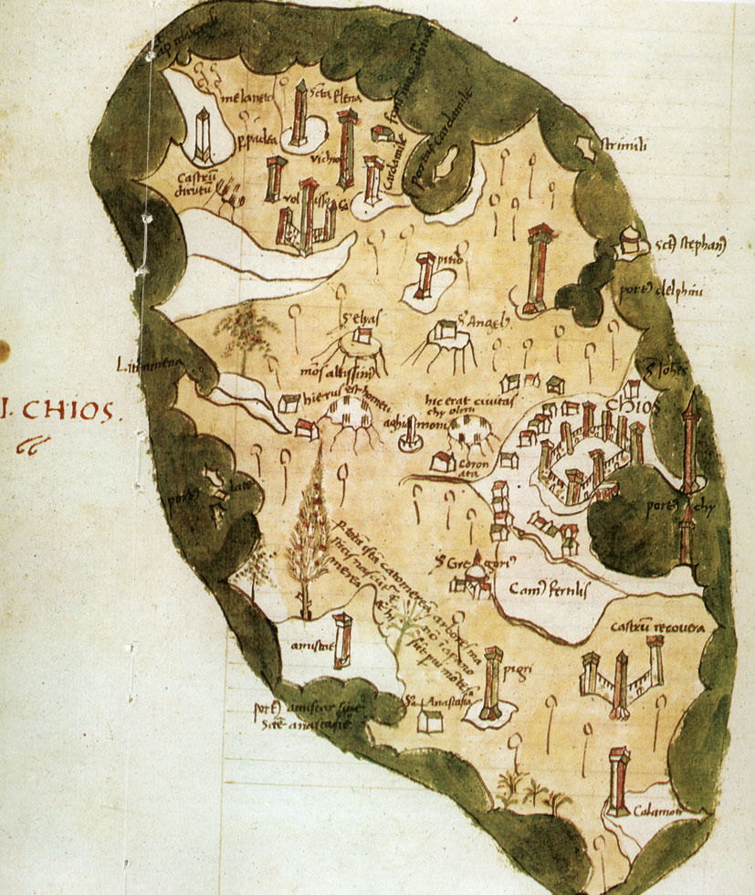 At the end of the 13th century, the entrepreneurs brothers Benedetto and Manuele Zaccaria de Castro – one of the noblest Genoese lineages – were granted by Michael VIII the right to assume the monopoly of the alum mines at Phocaea in Asia Minor. Alum was a mineral used in textile industries of northern Europe. The ore was shipped and stored in the port of Chios, and thence it was transported to the industries of the West and northern Europe by Benedetto’s fleet. Thus, already by 1277, Chios had become the link between East and West. Benedetto Zaccaria was the one who left his mark on the island. On account of various services he offered as an agent of the emperor, he was appointed Grand Duke (Megas Doux), which means he became chief admiral of the Byzantine fleet. In 1304, the Byzantine emperor Andronikos II Palaiologos granted to him Chios with a lease, as a reward for his contribution to the clearing of the Aegean from the pirates. The emperor would keep the suzerainty. Thus, Benedetto became the first Lord of Chios.2 One of his first actions was to reconstruct the island’s ruined defences, to rebuild and strengthen the town’s castle, to repair the port and by and large the infrastructure. His major achievement, though, with a long-term effect was the reorganisation of local economy, which he oriented towards export trade.